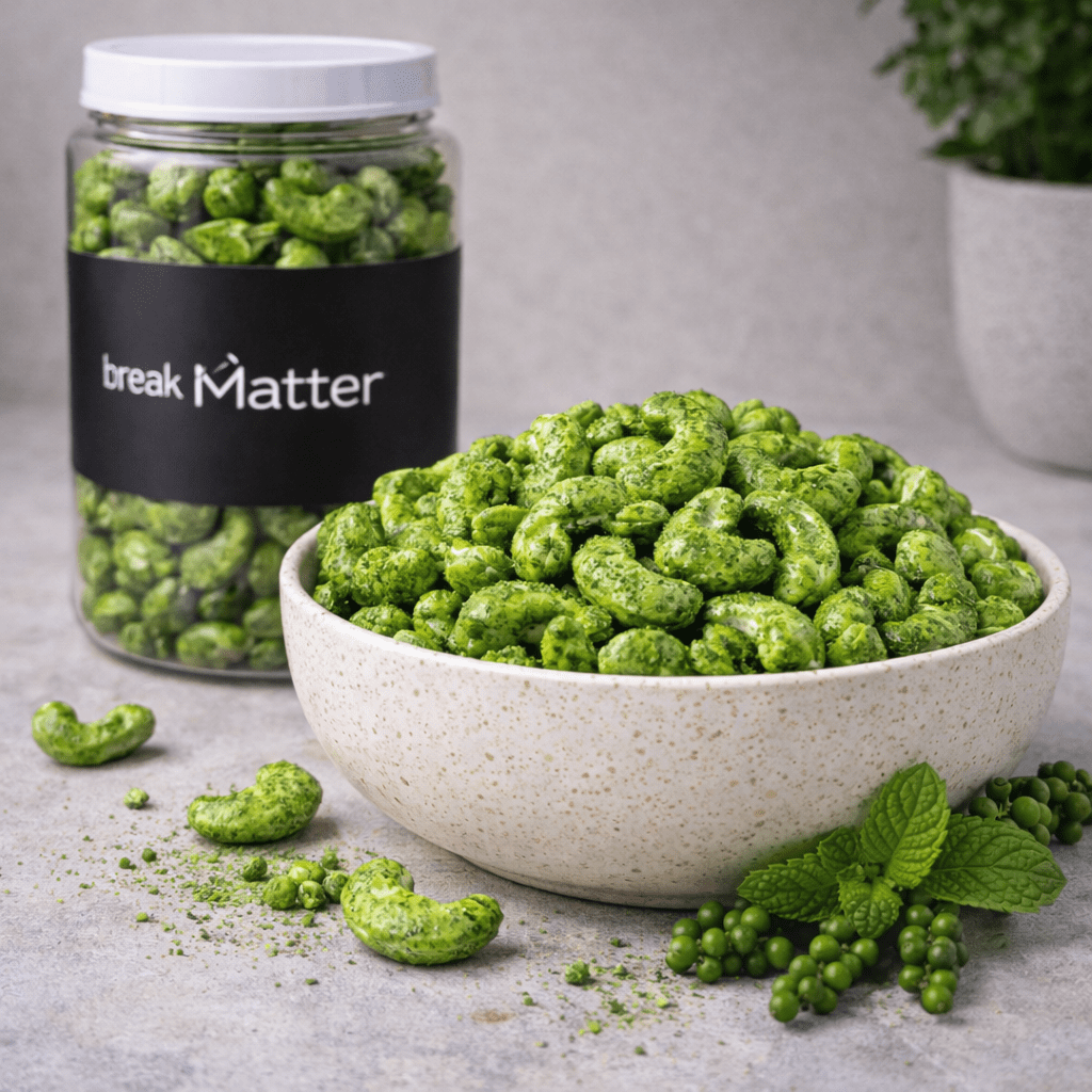 Experience the refreshing blend of cool mint and rich cashews. A delightful, aromatic snack!