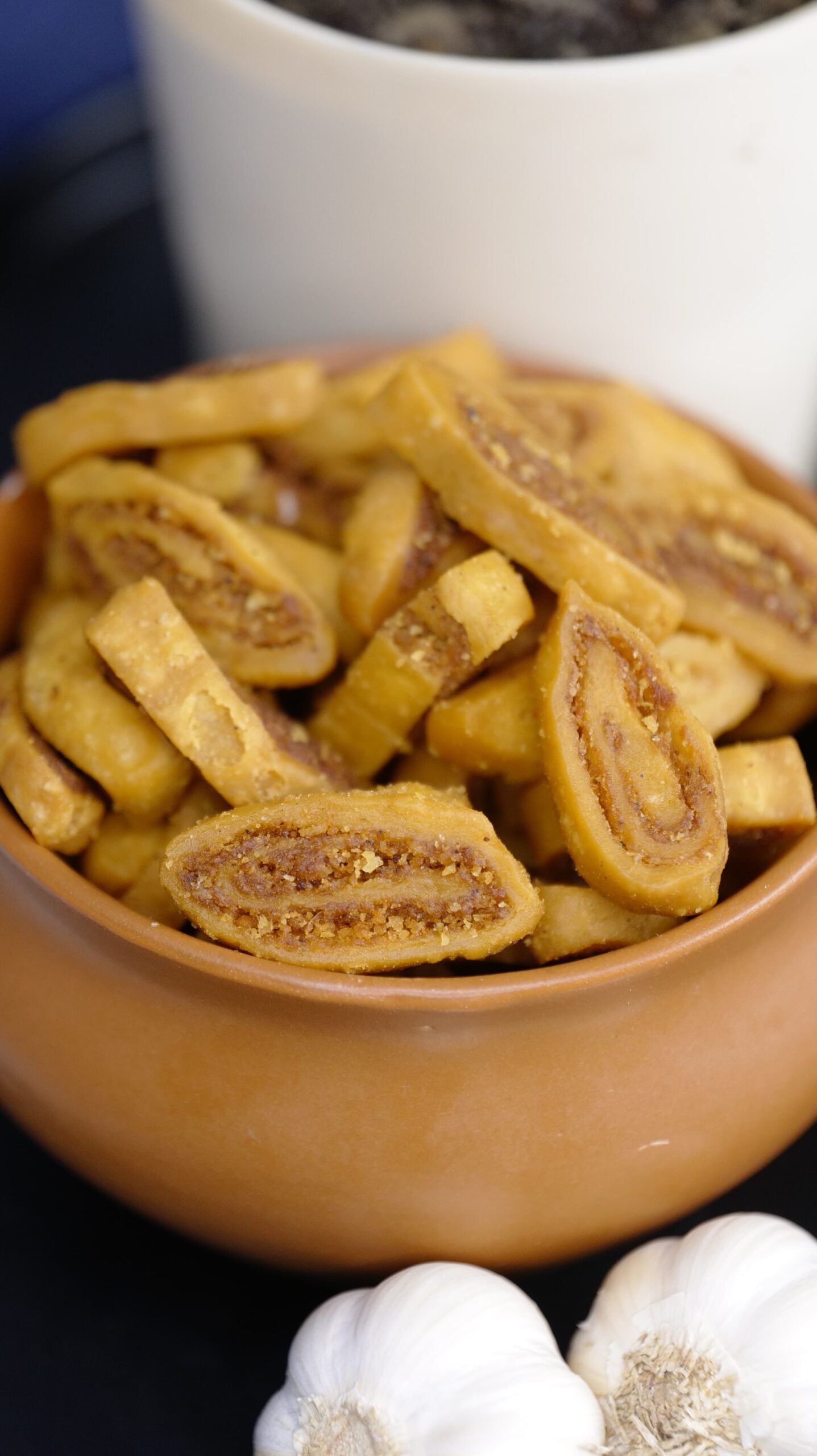A crispy, spicy, pinwheel-shaped Indian snack bursting with aromatic garlic flavor. Perfect with tea!